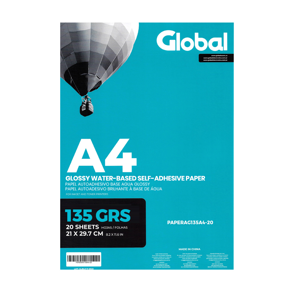 Papel fotográfico autoadhesivo marca Global de 135 gramos. Acabado brillante.
