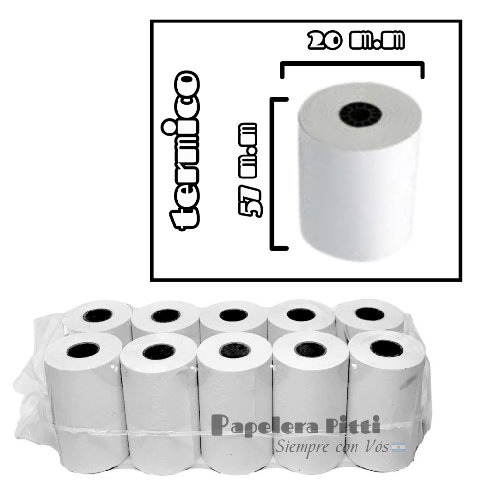 Pack de 10 rollos de papel térmico de 57mm de ancho por 20 metros de largo.